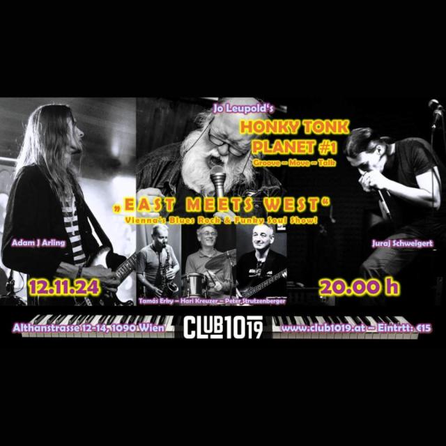 Honky Tonk Planet ist eine neue Veranstaltungsreihe im Club 1019. Im Mittelpunkt steht der Blues mit all seinen Facetten von Klassisch bis Electric, von Rock über Soul bis Funk. Pianist und Sänger Jo Leupold mit der Stammband bestehend aus Tamás Erky (Sax), Peter Strutzenberger (Bass) und Hari Kreuzer (Drums) organisiert ein vielschichtiges Zusammentreffen mit internationalen Gast-Musikern auf einer Bühne. Unter dem Motto "East Meets West" sind am Dienstag zu sehen und zu hören: Aus Chicago Adam J Arlington (Gitarre) sowie der Harp-Virtuose Juraj Schweigert aus Bratislava. Es wird spannend!